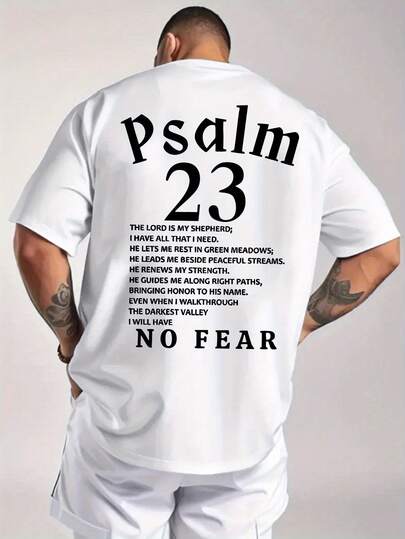 Men'S Psalm 23 Verse Print T-Shirt - Made Of 100% Polyester, Featuring A Regular Fit With A Round Neck And Short Sleeves, Suitable For Casual And Athletic Wear, Machine Washable. Inspirational Bible Verse Design, Casual Apparel, Bold Font Shirt