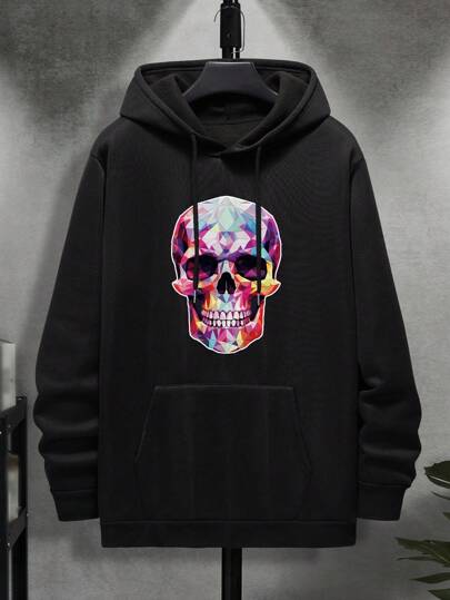 男士骷髅頭圖案袋鼠口袋抽繩加絨內裏連帽衫 - 黑色 - 查看 1