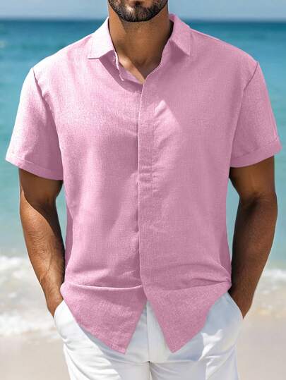 GLESTORE 男士复古风情亚麻质感纯色纽扣短袖衬衫,尽显老钱气质,四季皆宜的休闲百搭单品 - 粉色 - 查看 1