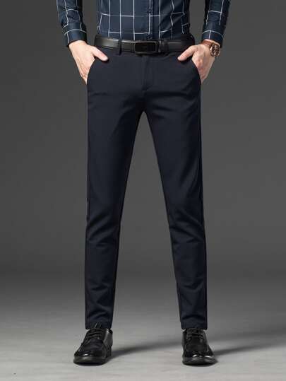 男士素色斜口袋定制西褲不附腰帶 - 藏蓝色 - 查看 1