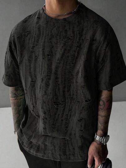 男士夏季破洞时尚休闲百搭短袖T恤 - 黑色 - 查看 1