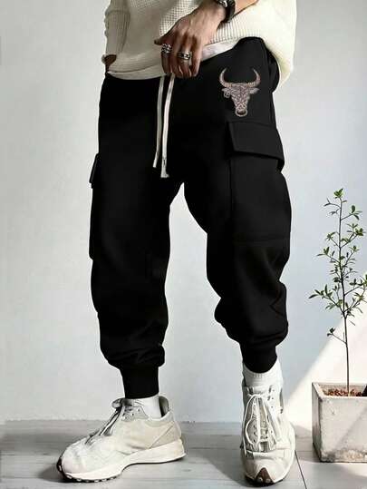 男士休闲时尚户外抽绳腰工装裤,秋冬款 - 黑色 - 查看 1