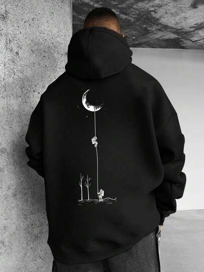 男士休闲月亮印花连帽卫衣,秋冬季长袖上衣 - 黑色 - 查看 5