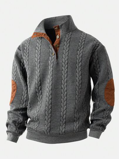 男士休闲纹理四分之一扣套头卫衣,简约时尚男士卫衣,长袖上衣 - 深灰色 - 查看 1