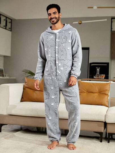 男士恐龙印花抓绒连体衣,休闲灰色家居服,秋冬款 - 灰色 - 查看 1