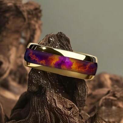 男士时尚戒指套装,紫橙渐变星空纹理设计,抛光金属戒托,优雅独特,是理想的结婚戒指礼物之选。紫色和橙色交织,宛如宇宙星云,营造出梦幻般的视觉效果。