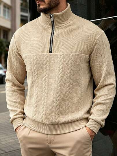 男士卡其色四分之一拉链 Polo 衫,混色针织拼接长袖休闲上衣,适合春秋季休闲、度假和日常穿着 - 卡其色 - 查看 1