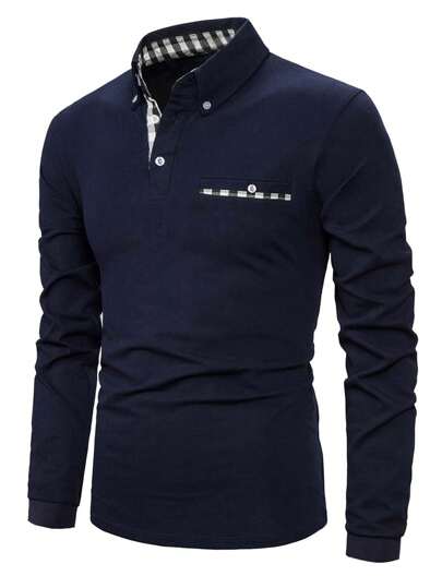 男士拼布格纹休闲 Polo 衫,秋季 - 藏蓝色 - 查看 1