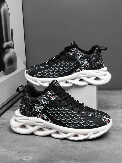 男士个性龙鳞拼布随机印花系带运动鞋,街头嘻哈风格不对称鞋底针织网眼缓震透气运动跑步休闲鞋