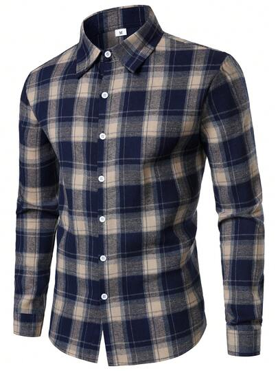 男式格子法兰绒休闲纽扣长袖衬衫 - 藏蓝色 - 查看 1