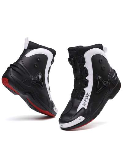 男士專業摩托車靴秋冬耐用防滑適合摩托車比賽紅色縫線圓頭高筒休閒拼色運動鞋繫帶 - 黑色 - 查看 1