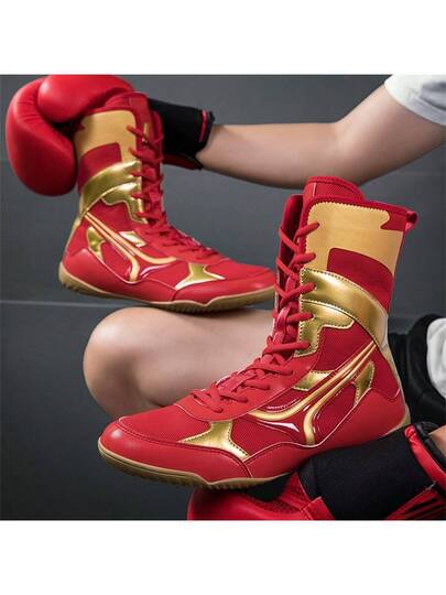 男士专业摔跤鞋,高帮竞赛训练鞋,摔跤鞋和健身靴,彩色拼接运动鞋,合成皮革和网眼材质,室内健身防滑拳击训练鞋,适合所有季节,尺码:39-48 - 紅色 - 查看 1