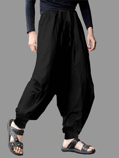 男裝單色低襠束腰長褲,休閒服飾 - 黑色 - 查看 1