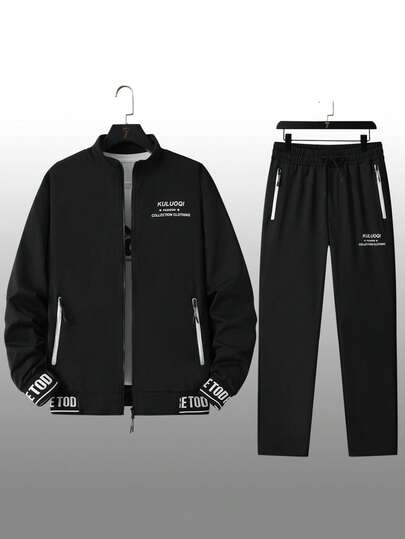 男士春秋立领标语印花长袖夹克和裤子休闲运动套装 - 黑色 - 查看 1