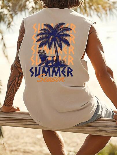 男士夏季印花圆领休闲背心 - 杏色 - 查看 2