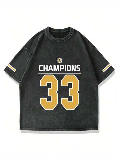 男士水洗复古印花图案T恤,印有数字33,简约设计,休闲街头风套头T恤,黑色 - 黑色 - 查看 1