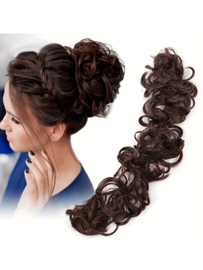 女性專用亂糟糟的蓬鬆頭髮套,合成纖維髮片,帶有扭曲馬尾和波浪蓬鬆髮髻 - 深棕色 - 查看 1