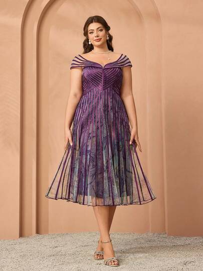 Mgiacy、新品、肩带、露肩、印花网眼、抽绳、大摆、高端晚礼服、适合、黑色领带活动礼服 - 紫色 - 查看 1