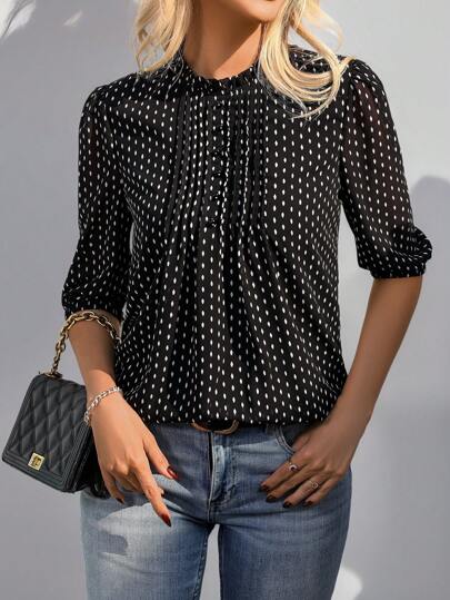 EMERY ROSE 中年女士雪纺中袖衬衫,夏季休闲衬衫,适合中老年人 - 黑色 - 查看 1