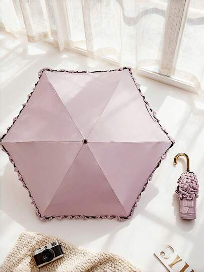 迷你折叠伞口袋蕾丝花边创意防紫外线学校便携旅行必备万圣节圣诞节弧形手柄遮阳伞女士礼物 - 粉色 - 查看 1