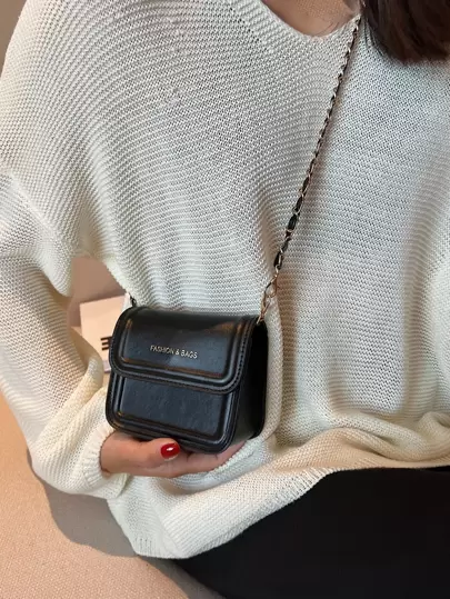 迷你字母圖案翻蓋鏈條方包 - 黑色 - 查看 1