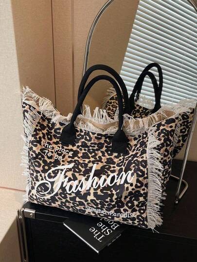 简约时尚帆布条纹手提包,女士单肩包,大容量休闲托特包,豹纹印花流苏装饰,新品上市 - 卡其色 - 查看 1