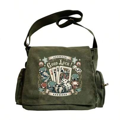 极简军绿色帆布斜挎包,大容量赌场幸运扑克骰子印花单肩包,复古休闲风格,适合日常、上学、通勤、购物