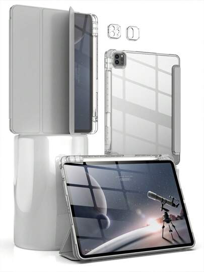 镜面苹果三折可折叠防摔平板电脑保护套适用于 iPad 带透明高透明度亚克力连接笔槽笔架-法国灰色 - 淺灰色 - 查看 10