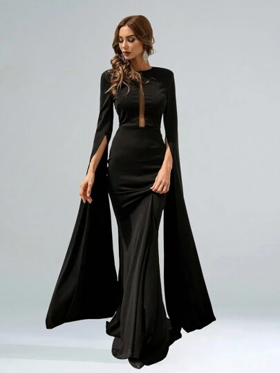 Missord 开袖网眼嵌件超长舞会礼服黑色优雅长袖正式晚会婚礼宾客礼服,适合毕业典礼、晚宴 - 黑色 - 查看 1