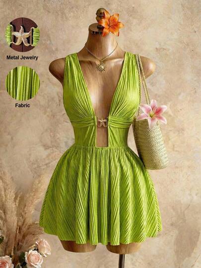 Mistrie 牛油果绿褶皱A字连衣裙,深V领露背收腰无袖短款派对鸡尾酒裙 - 綠色 - 查看 1