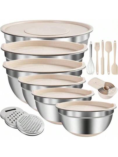 Mixing Bowls With Airtight Lids Set,20 PCS Kitchen Gadgets Set,6 Stainless Steel Bowls,3 Grater Attachments, Non-Slip Silicone Bottoms,Great For Serving&Baking, Size 5, 4, 3.5, 2.1, 1.5,1.1QT