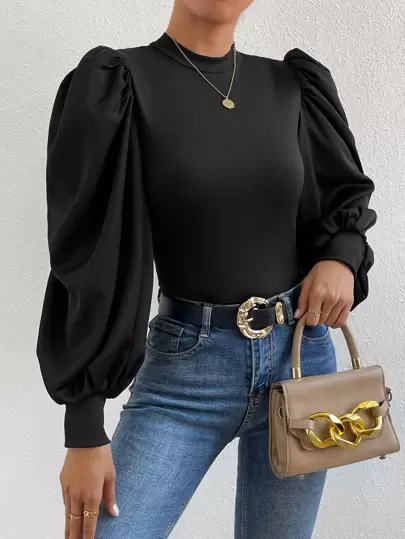 SHEIN Privé 小高領燈籠袖上衣 - 黑色 - 查看 1