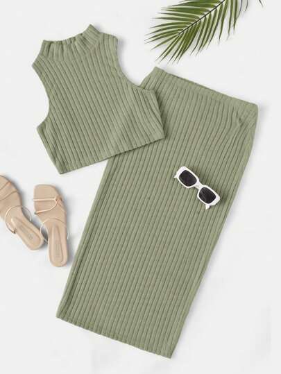 SHEIN EZwear 小高領背心上衣&半身裙 - 軍綠色 - 查看 1
