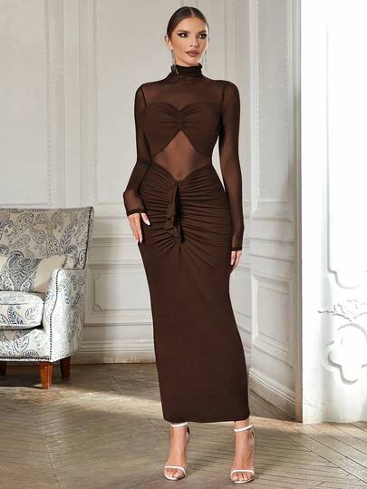 小高領前扭結褶邊緊身洋裝 - 巧克力棕 - 查看 1
