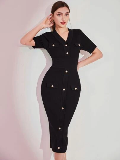 Modelyn 紐扣細節緊身毛衣洋裝 - 黑色 - 查看 1