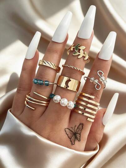 月牙珠减压叠层金戒指套装,甜美风格,女士款 - 金黃色 - 查看 2