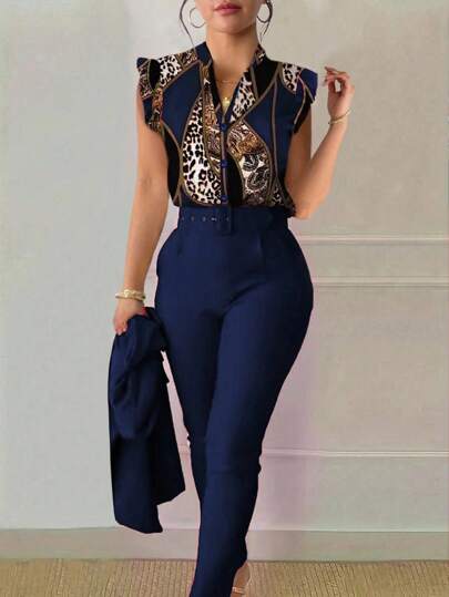 SHEIN Clasi 女士时尚通勤豹纹佩斯利印花衬衫和裤子两件套 - 藍色 - 查看 1