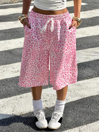 Muchica 女士豹纹抽绳腰带口袋休闲百搭日常穿搭阔腿短裤 - 粉色 - 查看 1