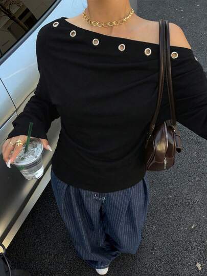 Muchica 女士新款不对称领口镂空设计腰部抽绳卫衣,黑色 - 黑色 - 查看 1