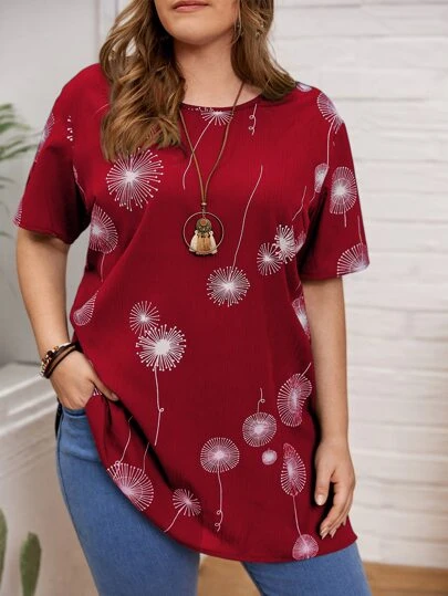 Mulvari 夏季加深红色蒲公英印花长款衬衫 - 酒紅色 - 查看 1