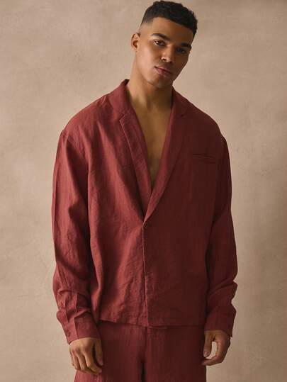 Musero 不对称长袖纽扣衬衫,时尚亚麻材质,贴边口袋设计,春夏假日必备单品 - 棕色 - 查看 1