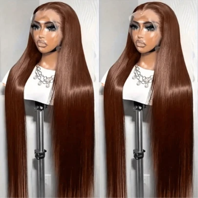 NATAN 13x4 巧克力棕色长直蕾丝前假发,适合,彩色透明高清合成蕾丝前假发,已预先拔毛 - S4 - 查看 1