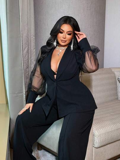 NU&NOW 通勤设计感黑色透视网纱拼接加大码套装 - 黑色 - 查看 1