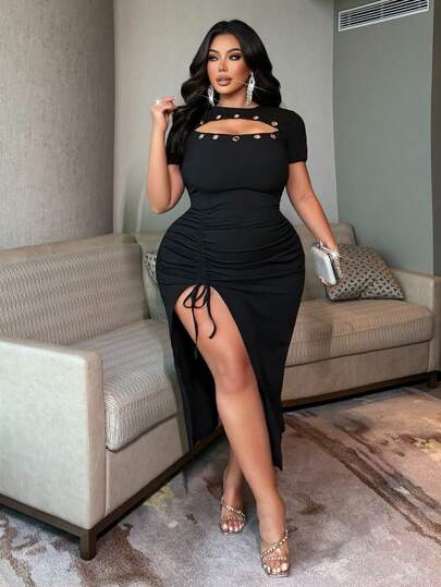 NU&NOW 大码女士性感针织罗纹连衣裙,镂空前片设计,金属孔眼装饰,不规则下摆,高开衩抽绳设计,修身剪裁,时尚百搭,适合派对、音乐节、度假、约会等场合,新款大码连衣裙,情人节必备,短袖中长款连衣裙 - 黑色 - 查看 1