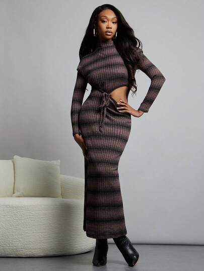NYA SZN 连衣裙长袖镂空毛衣修身特殊场合活动早午餐伊比沙岛酷女孩浪漫婚礼罗纹针织弹力超长秋冬女装 - 紫色 - 查看 1