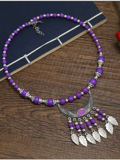 项链头饰二合一配饰,树叶吊坠项链颈链,流苏串珠项链,复古女士配饰 - 紫色 - 查看 8