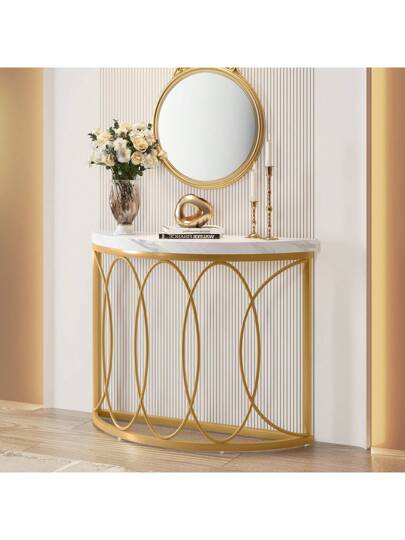 半月形金色控制台桌,43 英寸現代人造大理石入口桌,窄半圓形沙發裝飾桌,帶幾何金屬框架,適用於客廳、走廊,白色和金色 - 白色 - 查看 10
