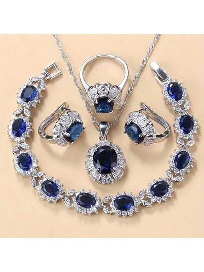 新款925镀银/18K镀金彩色立方氧化锆时尚派对奢华品质婚礼新娘优雅珠宝套装,女士项链吊坠耳环手链开口戒指,圣诞节、情人节、生日和周年纪念日的理想礼物 - 寶藍色 - 查看 18