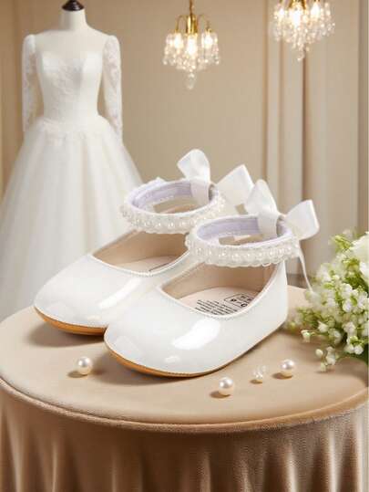 新款女婴玛丽珍平底鞋,蝴蝶结设计,防滑柔软PU皮鞋底,婴幼儿学步鞋,珍珠缎带装饰