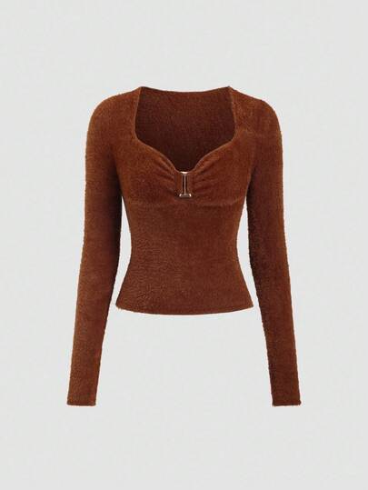 Sweetra 全新焦糖色V领金属装饰时尚性感都市束腰仿貂毛衣,秋冬 - 鏽棕色 - 查看 1